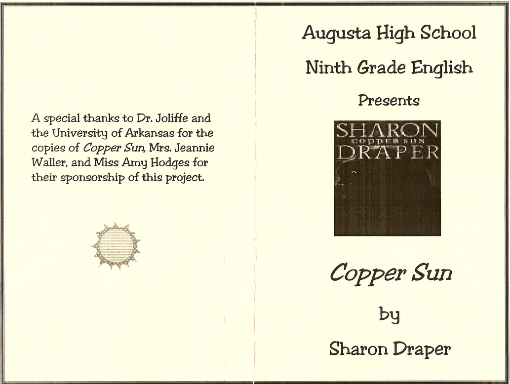 In this project, I collaborated with a fellow graduate student to choose an appropriate book for 9th graders to study during Black History Month, and we chose Copper Sun, a historical fiction book about a young girl who is forced to take the Middle Passage and become a slave in the Carolinas. We assisted the students’ English teacher with developing lesson plans, and we met with the students several times to arrange for a community-wide exhibition of their reaction to the book. We were pleased to hear from parents and teachers that teens who had not previously shown an interest in reading had devoured Copper Sun. The final exhibition reflected a unique 9th grade mix of heartfelt responses to the book and humorous remarks just when things got a little too serious.