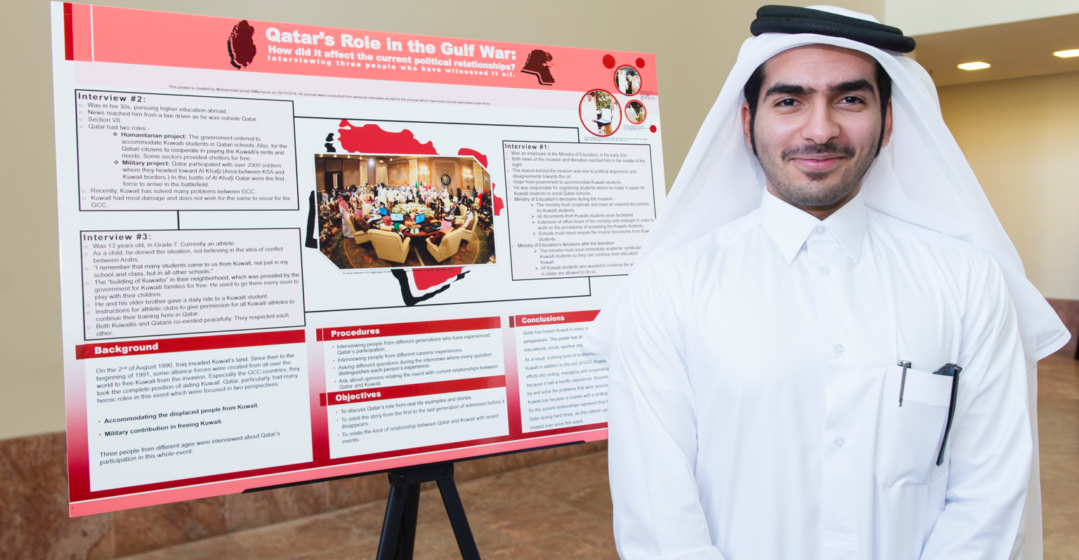 I taught a first-year critical thinking seminar with community literacy methodology in Qatar, and this course was an incredibly rewarding experience for me and my students. While working on this set of assignments, they conducted oral histories on issues that mattered to them and to the multinational society of Qatar. Many of my students were Qatari, and most of their projects were on issues related to their heritage: Qatari wedding traditions, relationships between Qatar and other Gulf nations, globalization and its impact on Qatari identity, Arab folklore, food and diet of Qatar, and transportation in the Arabian Gulf. Other students incorporated transnational topics such as technology and its impact on modern life, parent-child relationships across generations, expatriates and refugees, religious identity, and ethnic identity. Student reaction to this course was very favorable, and their enthusiasm for the project and spectacular performance at the public exhibition secured additional funding for the Liberal Arts program and sparked a revitalization of the critical thinking seminar’s course outcomes.