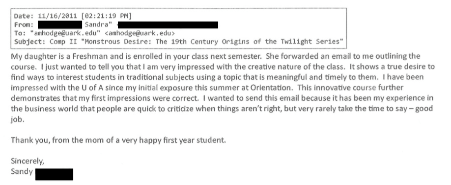 My daughter is a Freshman and is enrolled in your class next semester. She forwarded an email to me outlining the course. I just wanted to tell you that I am very impressed with the creative nature of the class. It shows a true desire to find ways to interest students in traditional subjects using a topic that is meaningful and timely to them. I have been impressed with the U of A since my initial exposure this summer at Orientation. This innovative course further demonstrates that my first impressions were correct. I wanted to send this email because it has been my experience in the business world that people are quick to criticize when thing aren’t right, but very rarely take the time to say – good job.